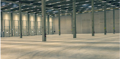 Noliktavas grīda ir izgatavota no monolītas betona plāksnes, kas armēta ar tērauda šķiedrām. Grīda ir